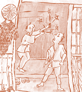 むかし、むかし、それはそれは、大へんなけちんぼの人があったんやといのう。 神だな(かみだな)や、おぶつだんに、おとうみょうをあげるのにも、ローソクや油(あぶら)はつかわんのやと。ほいて、火打石(ひうちいし)と火打金(ひうちがね)で、ケチン、ケチンとやって、 「そら、おがめ、そら、おがめ。」 と、いうて、チカッ、チカッと光る(ひかる)ときにおがむようにしとったといのう。 |