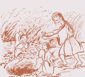 「今度(こんど)は、川のふちに埋めて(うめて)しまおう。」 って、大きな深い(ふかい)穴(あな)を掘った(ほった)んやと。又(また)、二人を連れて出かけたんやと。おっかさんは、何くわぬ 顔をして、 ほの穴の中へ、お銀をつき落として帰ってもたんやと。 「小銀ちゃん、助けてぇ。」 「お銀ちゃん、しっかりして!!」 「小銀ちゃん、早く助けて!水が入ってくるのよ。だんだん深くなるのよー。助けてー。」 とうとう声も小さくなり、聞こえなくなってもたんやと。 |
